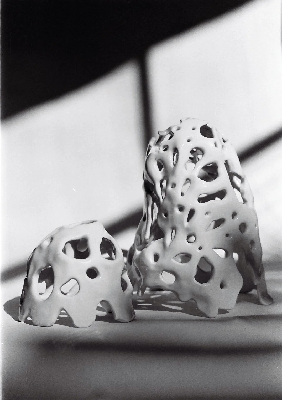 En estas primeras Gemas surge una obsesión por el colapso que se sostiene. Como reminiscencia de mi primer acercamiento a la escultura —a través de la fabricación de prótesis de maquillaje— aparece la textura: una compulsión/meditación hecha piel.